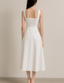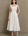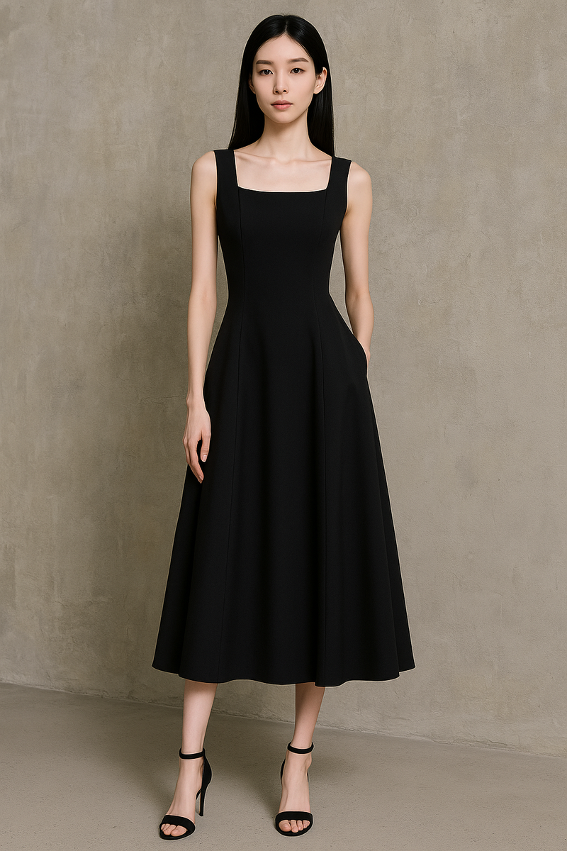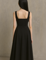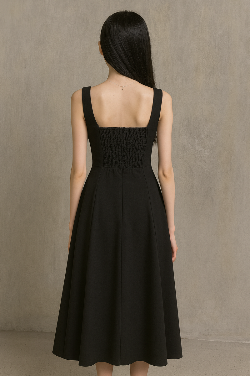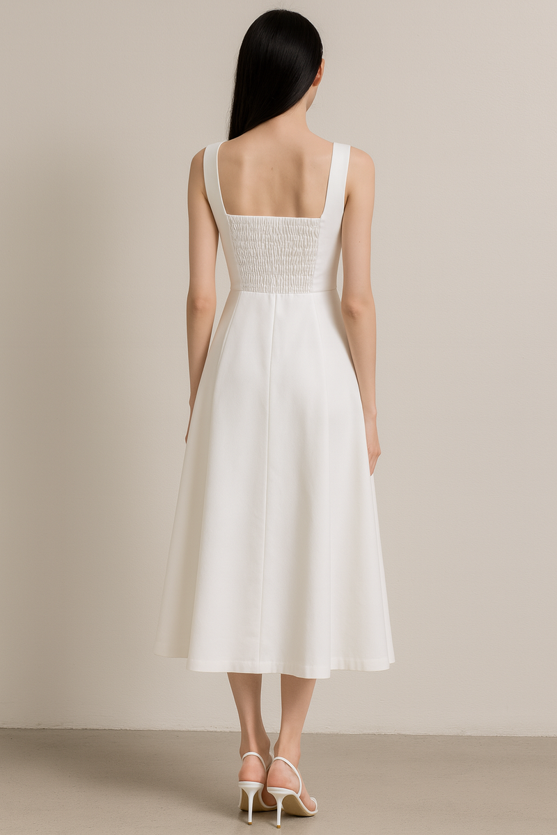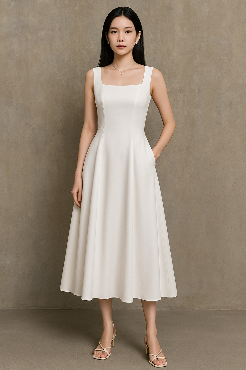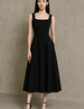 Featuring a structured square neckline and slightly thicker straps for a confident, modern silhouette. The gentle cinch at the waist flows into a softly flared skirt, creating a timeless shape that complements every body type.